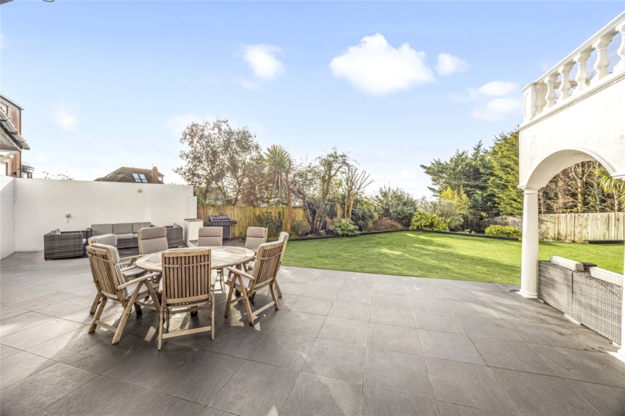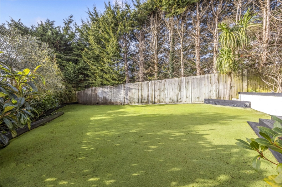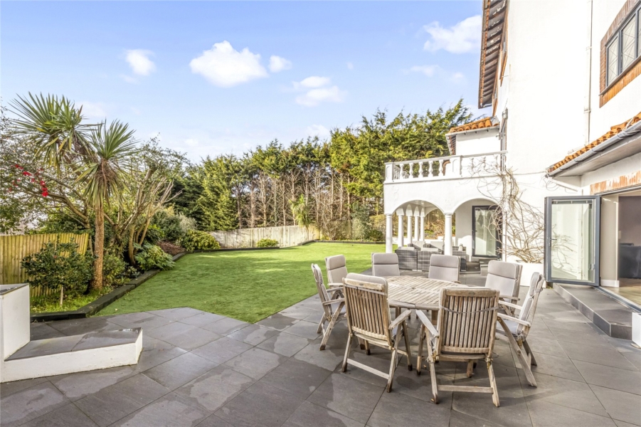 Outside, the gardens have been carefully designed to complement both the scale of the house and its elevated position. A generous level lawn is bordered by mature planting for privacy, while raised terraces create idyllic spaces for outdoor dining and relaxed entertaining, all enjoying views towards the coastline and sea beyond.