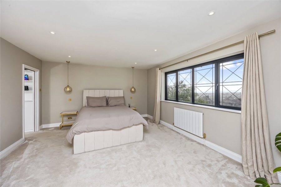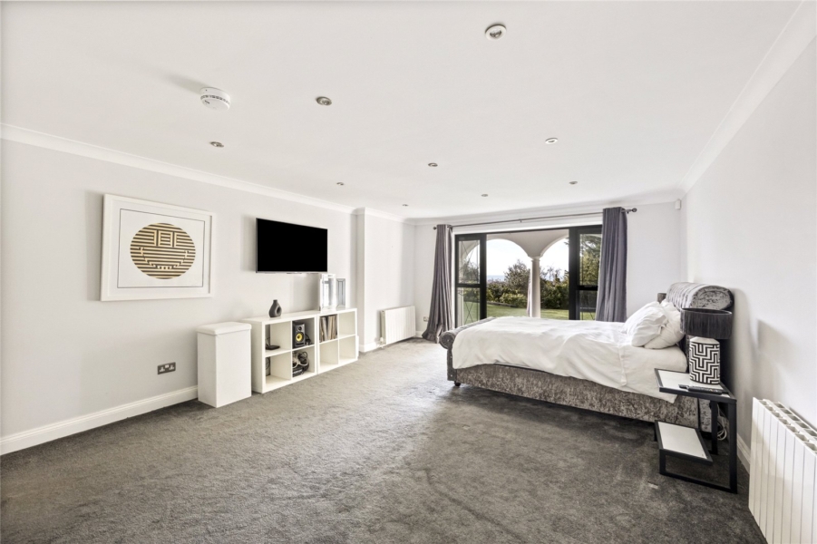 The upper floor of the main house is arranged around the principal bedroom suites, each offering generous proportions, privacy and sea views. The main and second bedrooms both benefit from walk-in wardrobes and stylish en- suites, while further bedrooms are served by high-quality bath and shower rooms.
