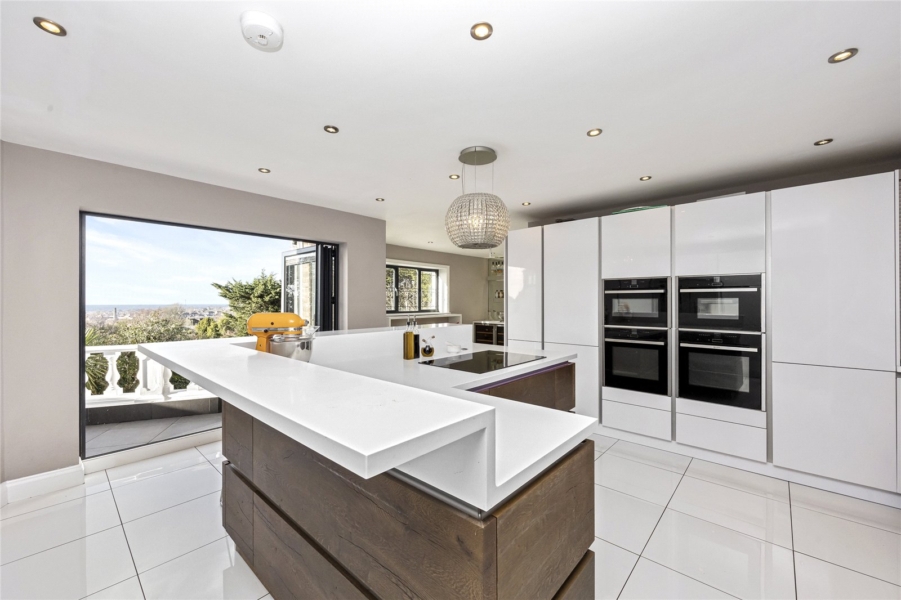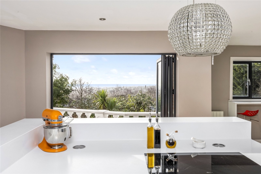 At the heart of the home lies a striking contemporary kitchen, designed as a social hub. Sleek cabinetry, integrated appliances and a substantial central island provide both style and functionality, opening seamlessly into the separate dining area and principal family reception room. Bathed in natural light, these spaces extend onto the balcony and rear aspect, where far-reaching sea views form a spectacular backdrop. A dedicated office on this floor offers a peaceful and practical work-from-home retreat.