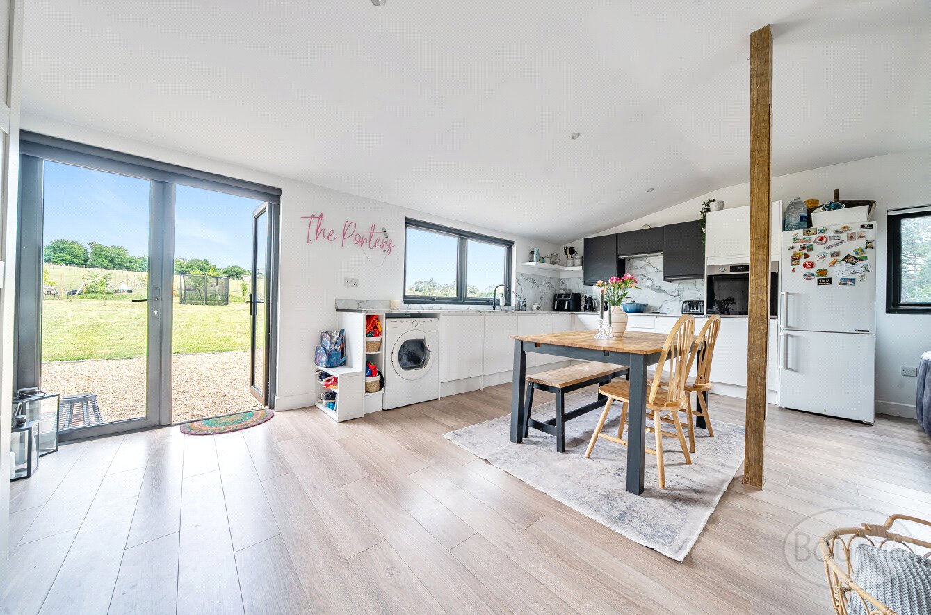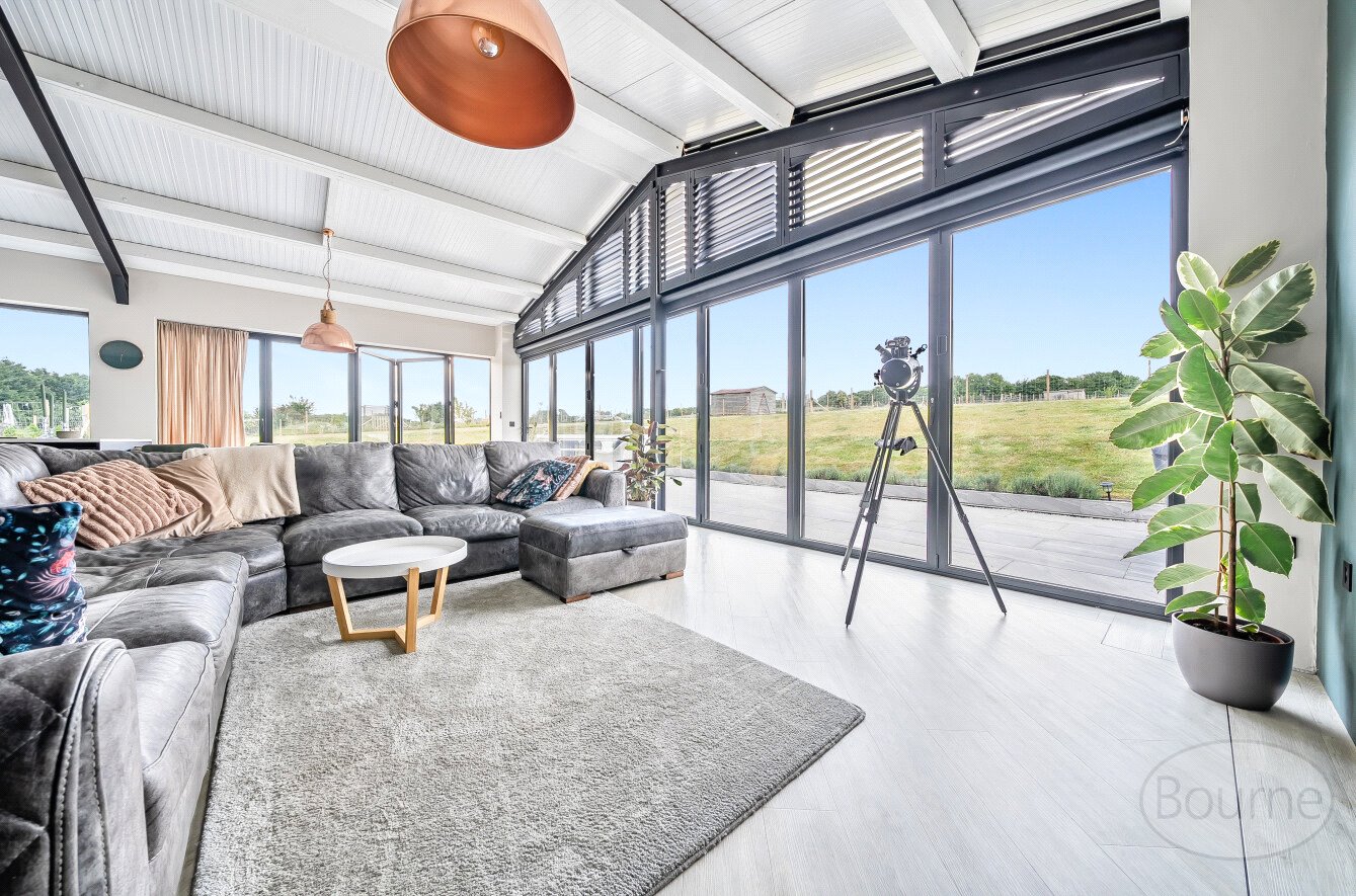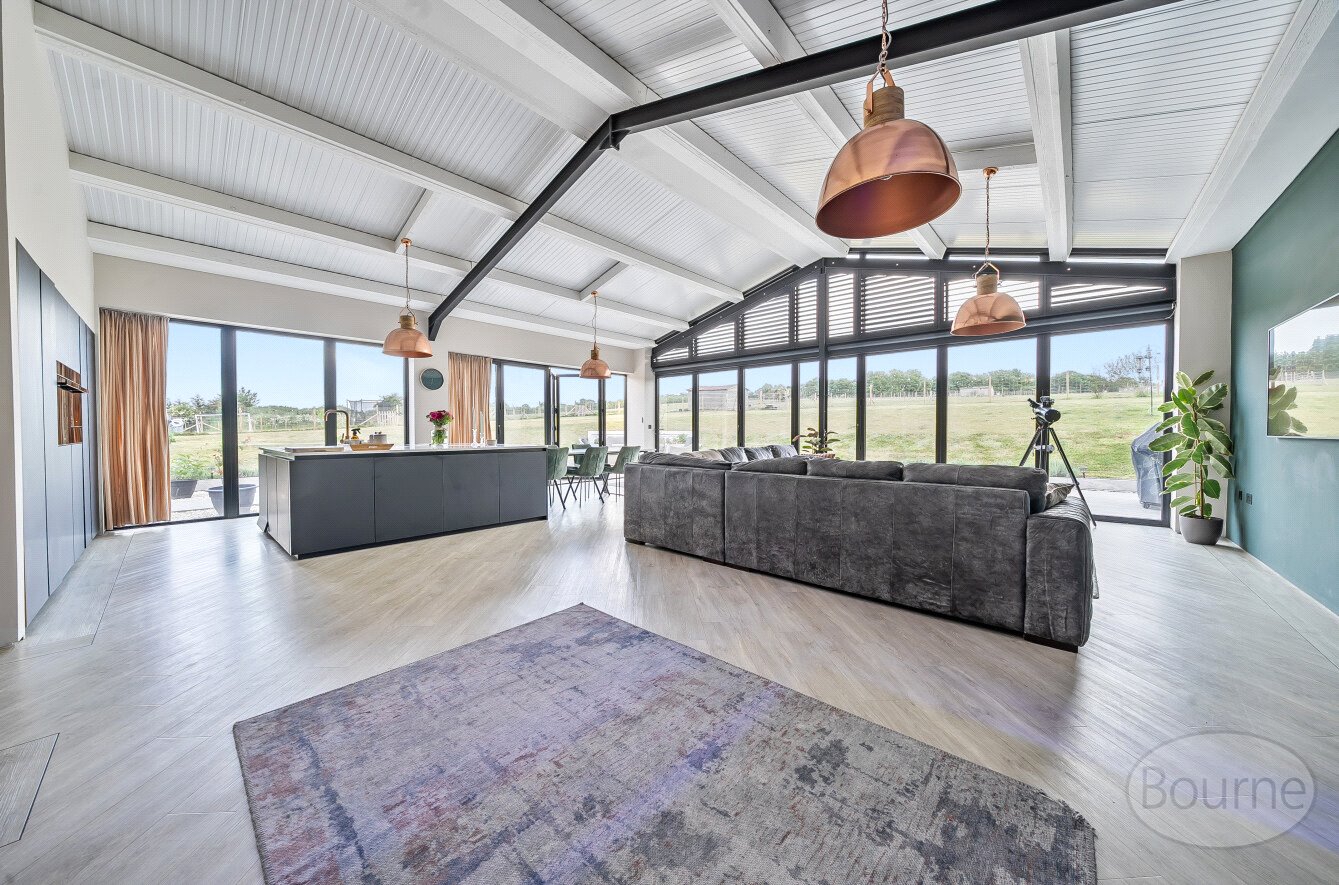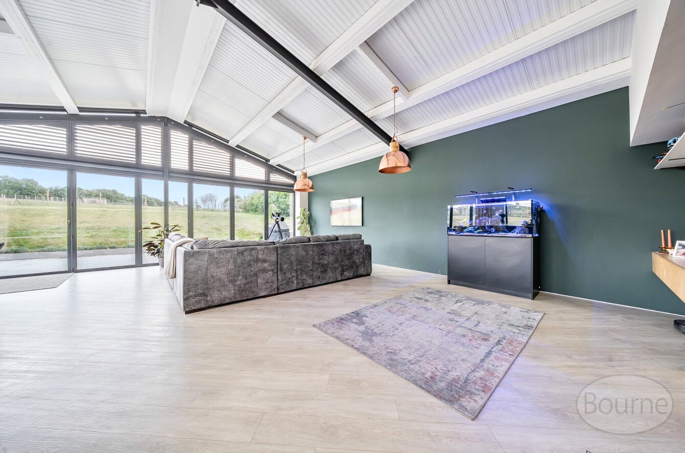 At the heart of the home is a spectacular open-plan kitchen, dining, and living area with soaring vaulted ceilings, exposed beams, and expansive bi-fold doors on both sides. These flood the space with natural light and provide uninterrupted views of the surrounding land, creating a seamless connection between indoor and outdoor living. This impressive room is perfect for both everyday family life and entertaining on a grand scale. A separate utility room adds practicality, providing ample space for laundry and additional storage.