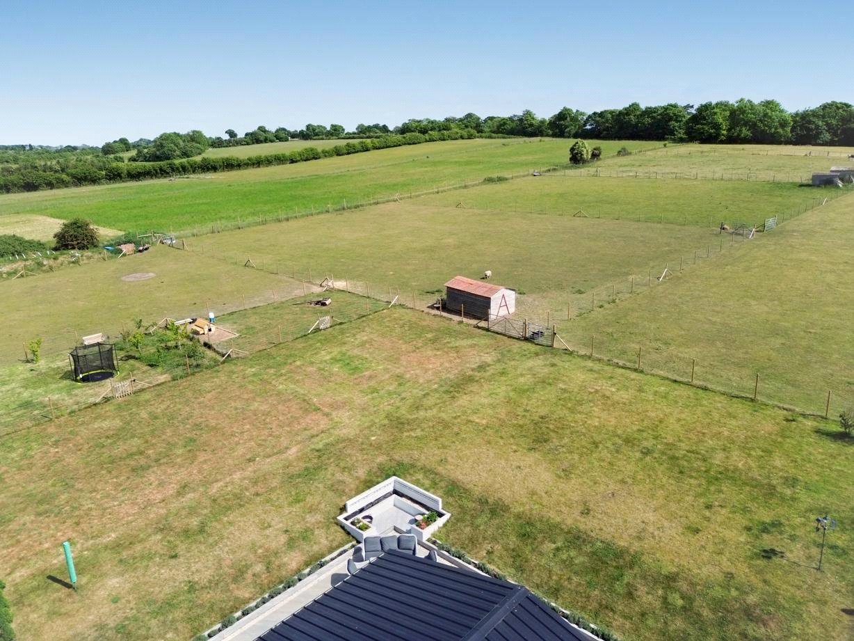 Externally, the property continues to impress. The nearly four-acre plot is predominantly laid to well-maintained pastureland, ideal for grazing animals or recreational use, and bordered by mature hedgerows for privacy. A recently installed, paved seating terrace offers the perfect setting for outdoor dining and entertaining, with views across the tranquil landscape. To the side of the main house is a useful storage area and ample off-road parking for multiple vehicles, along with eco-friendly solar panels and an air source heat pump system that supports the home’s efficient electric heating.