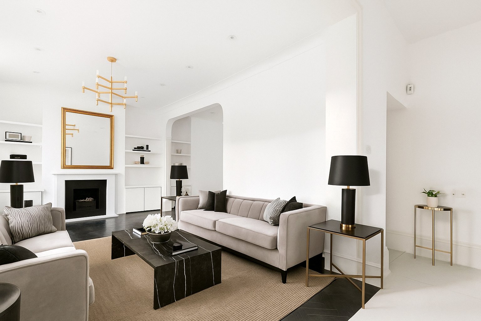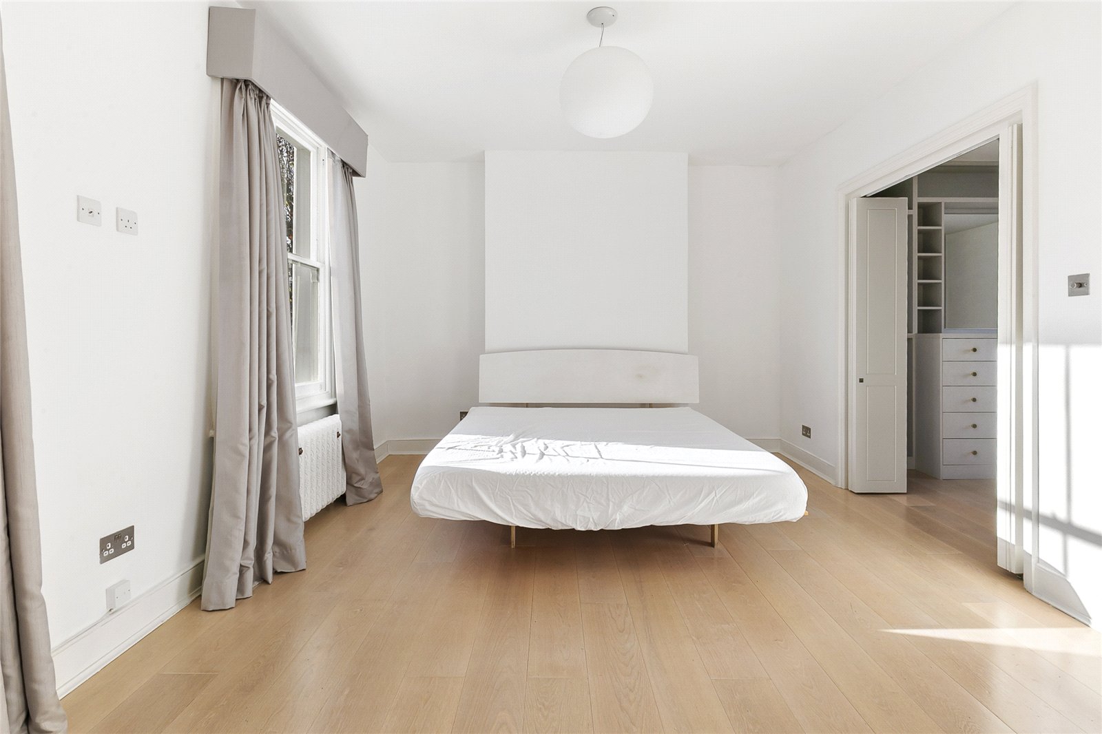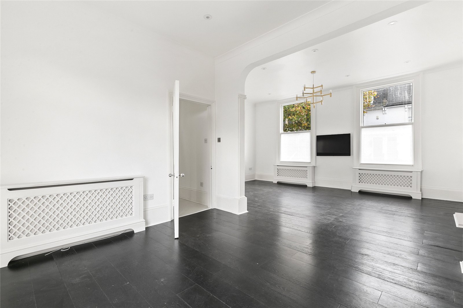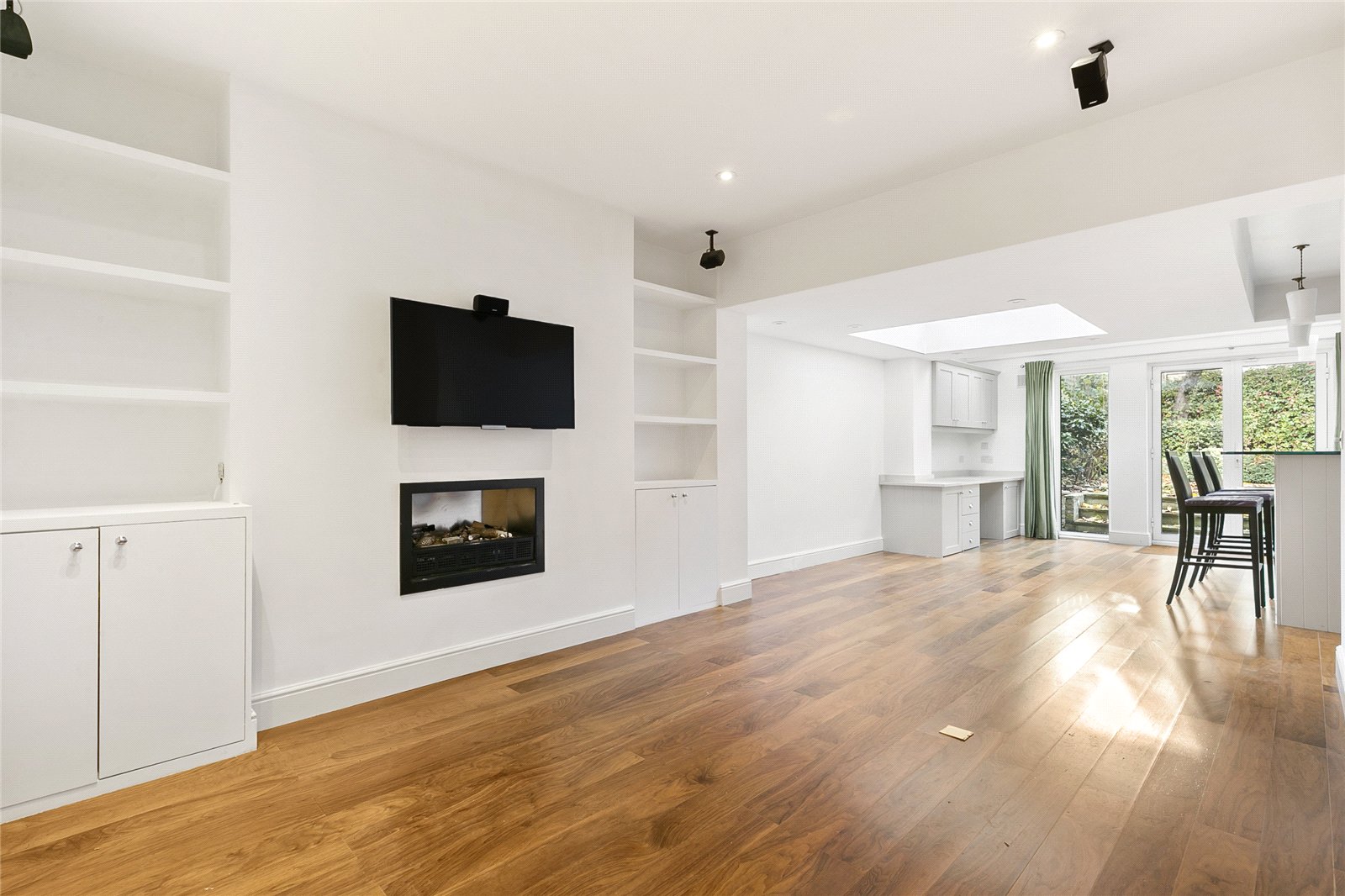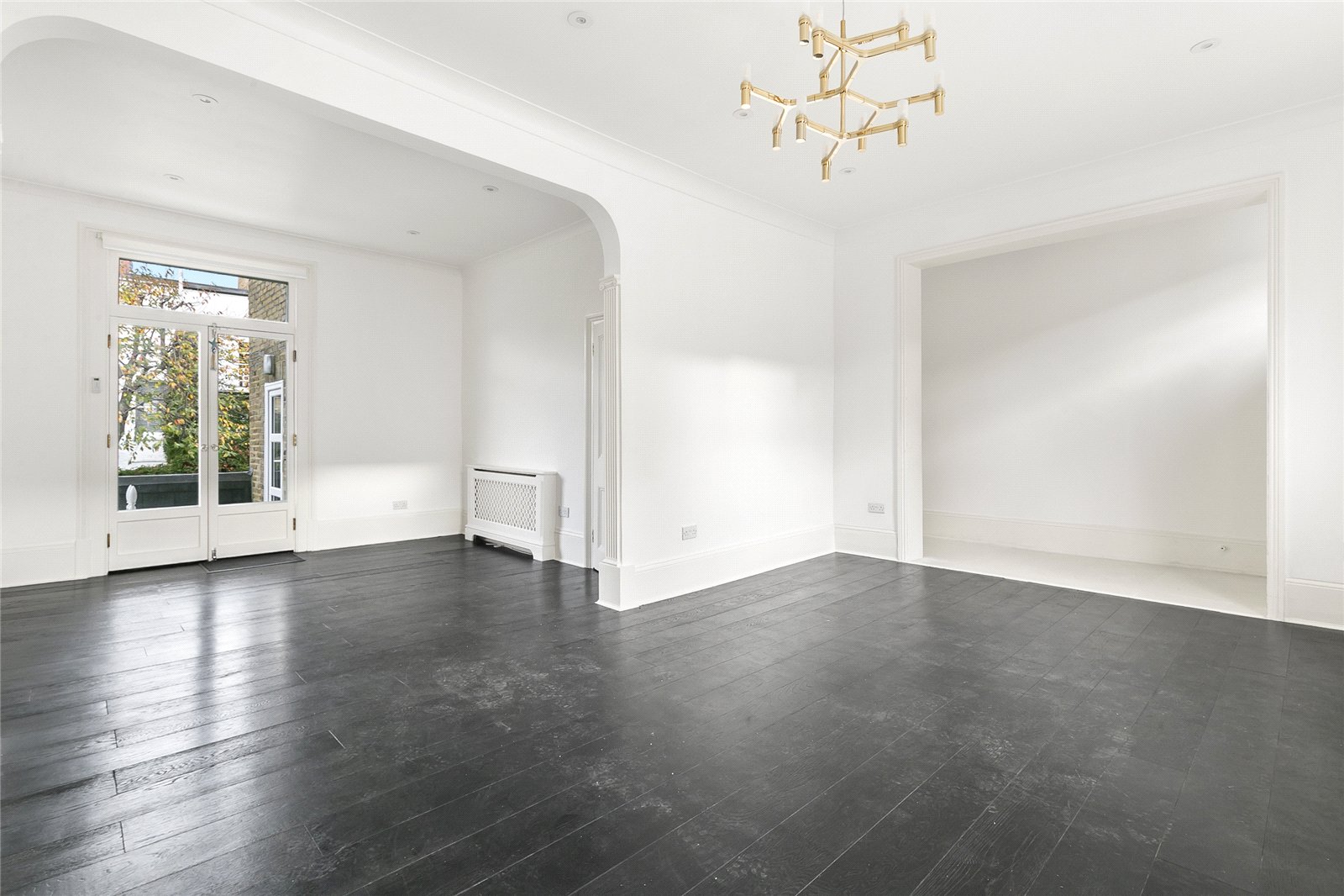 The house is entered on the raised ground floor and there is an additional separate entrance at the natural lower ground floor level. The spacious entrance hall leads to a wonderful L-shaped reception which spans the width of the front elevation and has French doors overlooking the rear garden. Tall sash windows, built-in shelving, a modern fireplace and dark stained floors complement the room's elegant proportions.