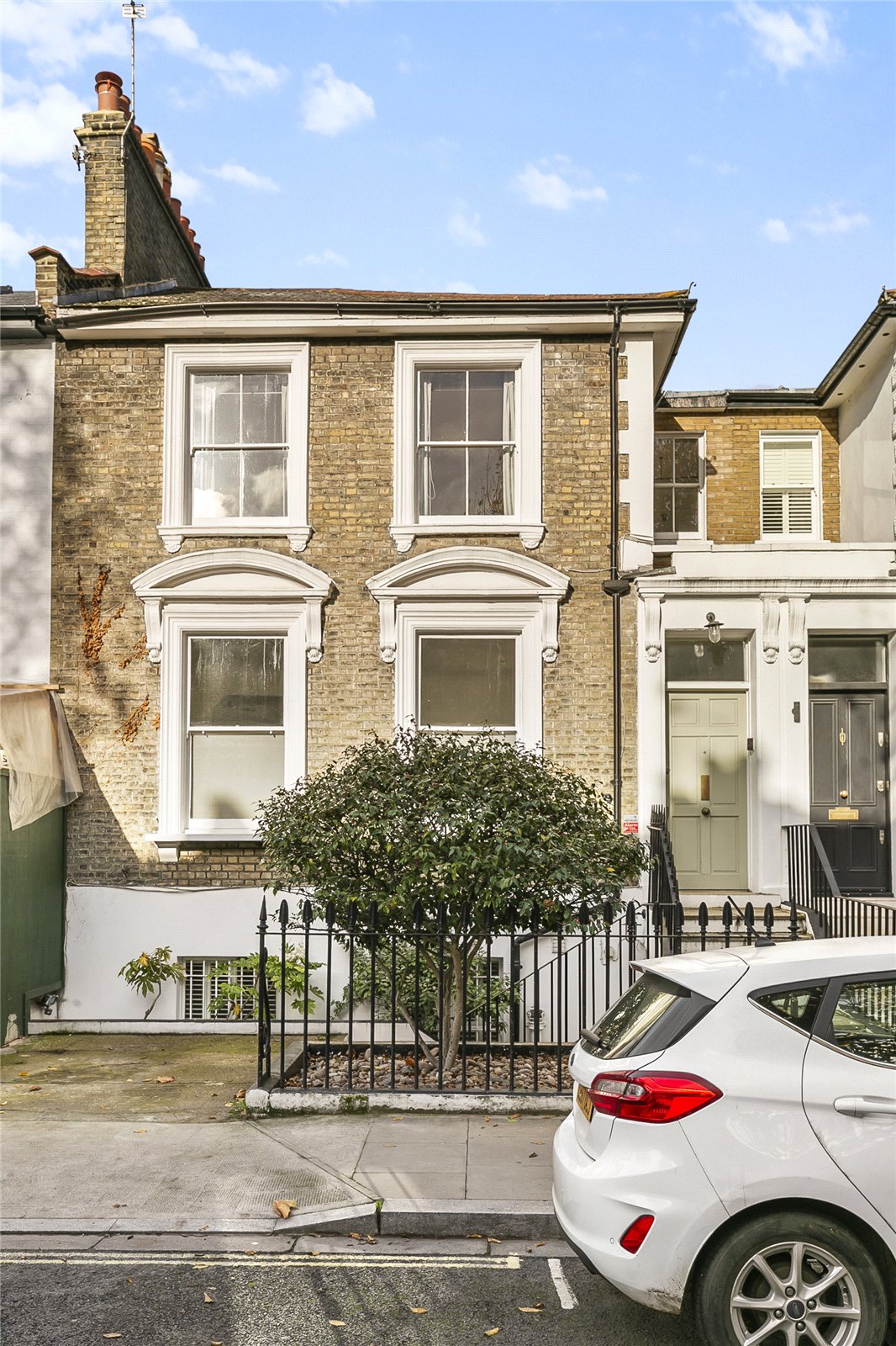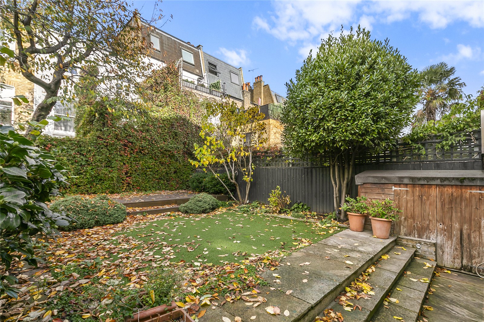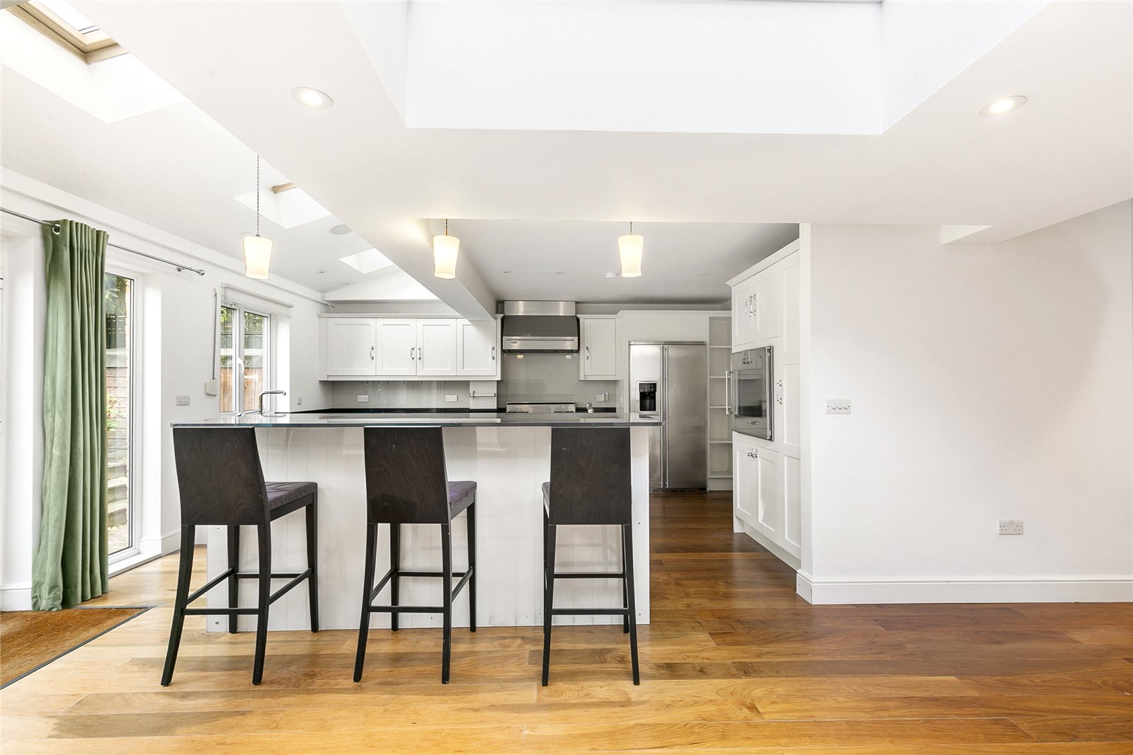 The stairs leading to the lower floor go past a rear-facing double bedroom and guest WC on the half-landing. The lower ground floor has a wonderful, bespoke kitchen which has been designed to professional standards and which overlooks the garden. It is open-plan to a comfortable seating area which makes this whole area the heart of the home. At this level there is also another bedroom and full bathroom as well as a utility room and storage space under the front steps. The master bedroom on the first floor has built-in wardrobes and en suite bathroom. There are two further bedrooms, each with built-in wardrobes, and a separate shower room/WC. The sizeable garden has been sympathetically landscaped and enjoys a generous paved al-fresco dining area as well as mature shrubs and plants.