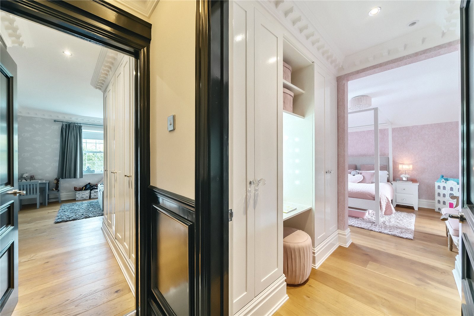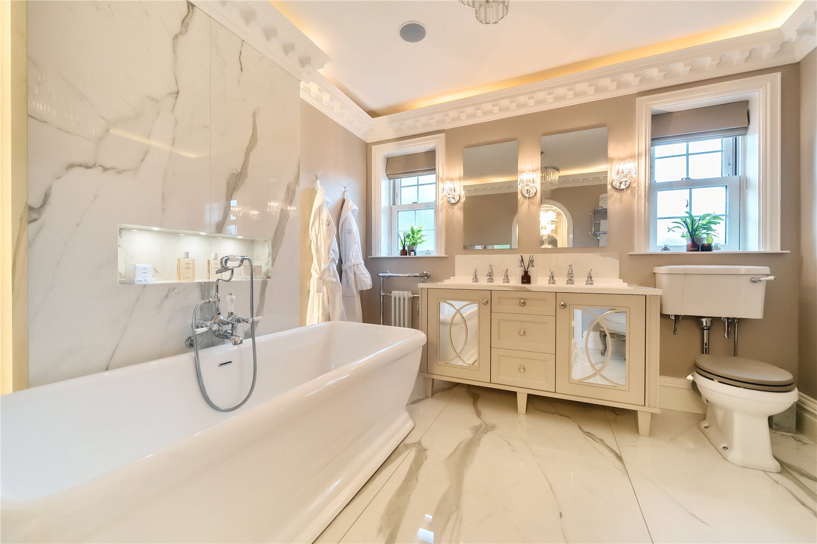 Upstairs, you will find four double bedrooms, each with their own luxurious ensuite bathroom, beautifully appointed with premium fixtures and fittings. The master suite is a true sanctuary, complete with a bespoke luxury dressing room, double sided fireplace, roll top bath, double vanity and in-ceiling music system, adding a touch of grandeur to this already magnificent space.