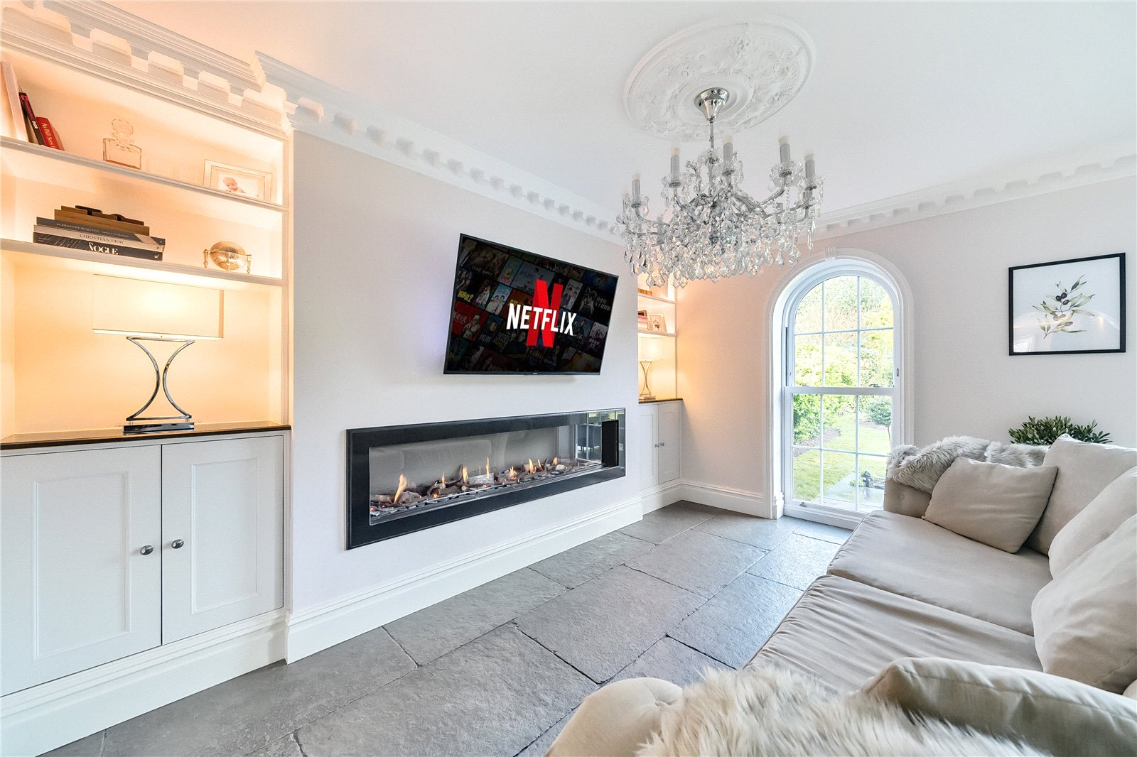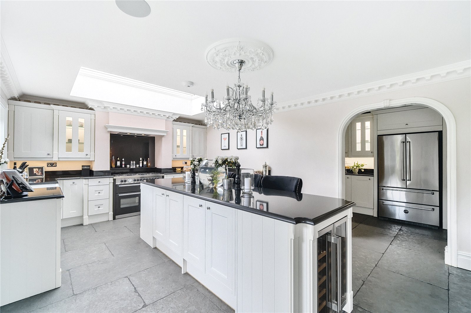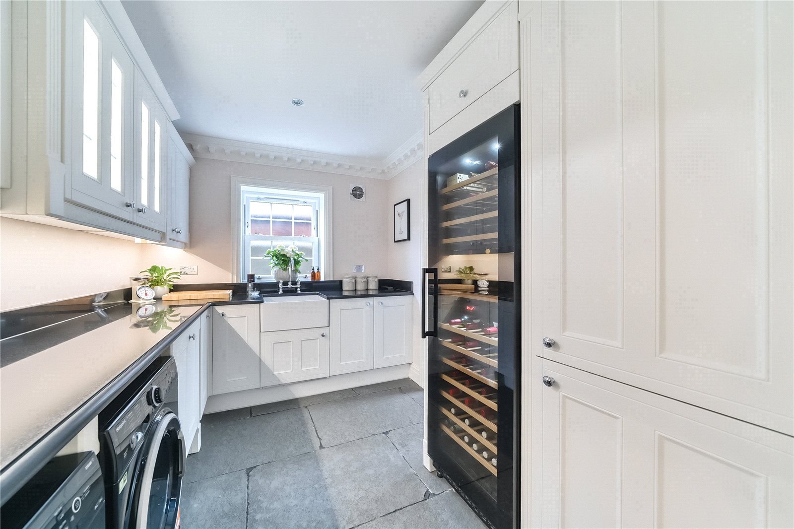 The luxurious kitchen with high-end appliances is a beautiful focal point, featuring a heated limestone flagstone floor, fireplace and seating area, with a large island, range cooker and dining space overlooking the private and well-established garden. With sleek granite worktops and ample storage space, there is also a separate utility and laundry room to service this beautiful home.