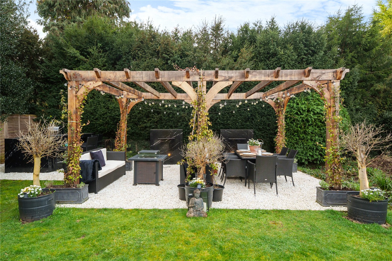 Outside the grounds of Woodham Lodge are peaceful and tranquil, enclosed and secluded, providing ultimate privacy. The kitchen garden contains soothing marble water features, a double-door drinks fridge, top of the range BBQ and pizza oven as well as plenty of space to relax or entertain.
