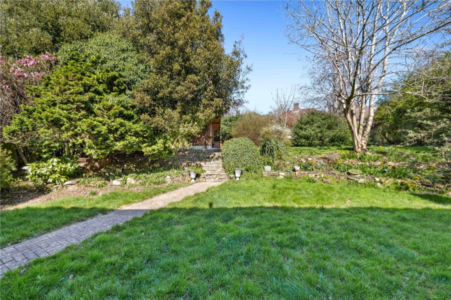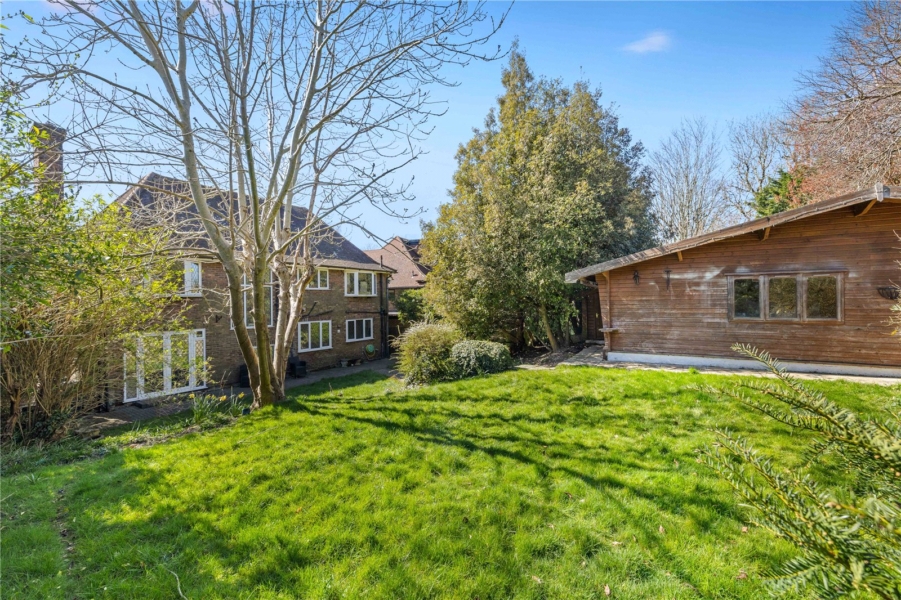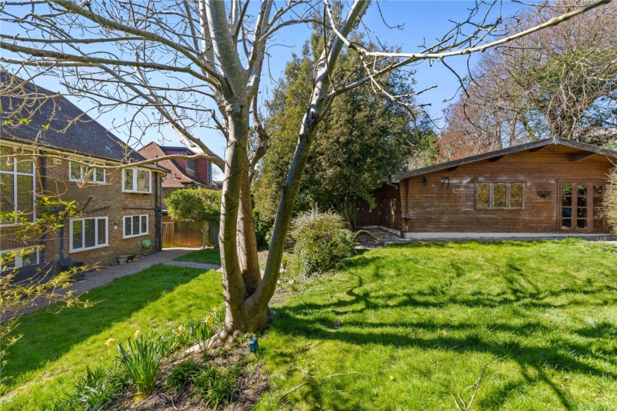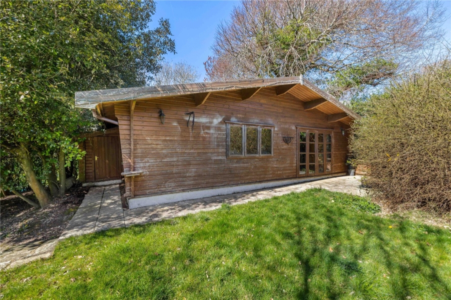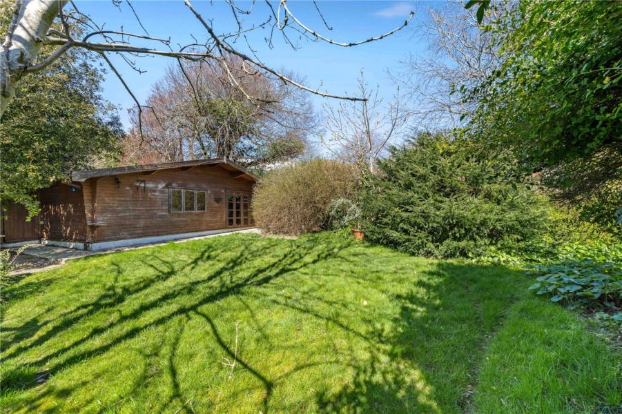 Outside, the secluded garden is a true retreat — perfect for summer barbecues, peaceful mornings, or a safe place for children to play. Tucked away in the garden is a large timber cabin that once housed an indoor pool. This versatile space could be reimagined as a guest annex, gym, home office, or even returned to its former use.