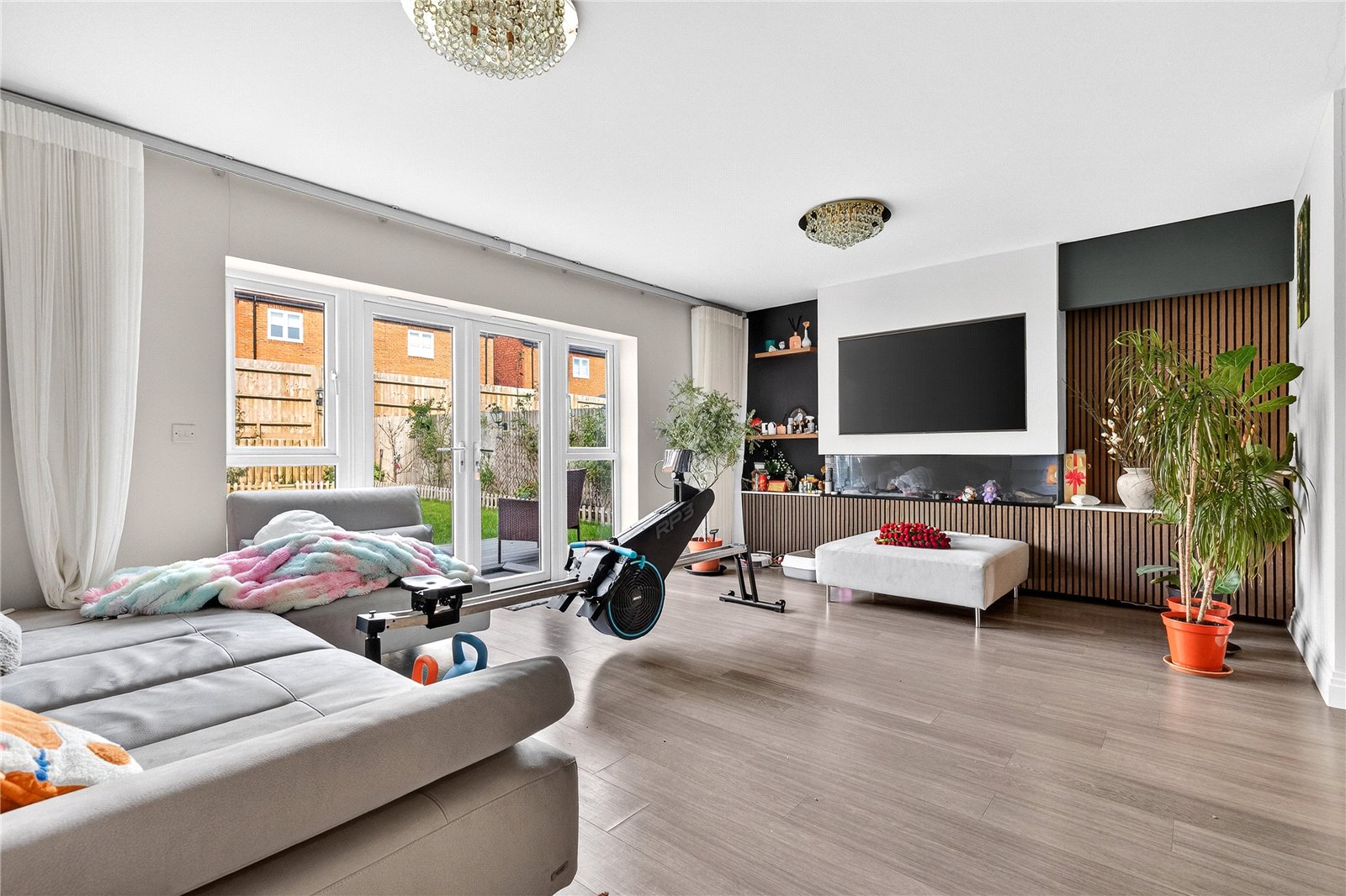 The true showpiece is the breathtaking open-plan kitchen, dining, and living space at the heart of the ground floor – a vast, light-filled room stretching over 25 feet in length, where the owners have created a stunning media wall that anchors the room with effortless contemporary style. Whether you’re hosting a lively family dinner, settling in for a film night, or keeping an eye on homework from the kitchen island, this space flexes seamlessly to meet every moment of family life.