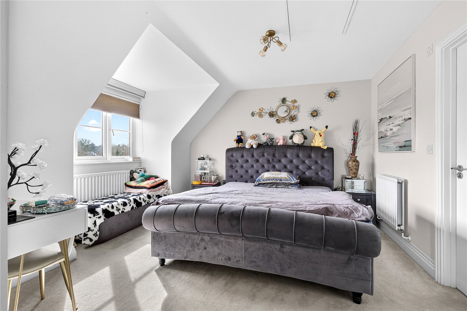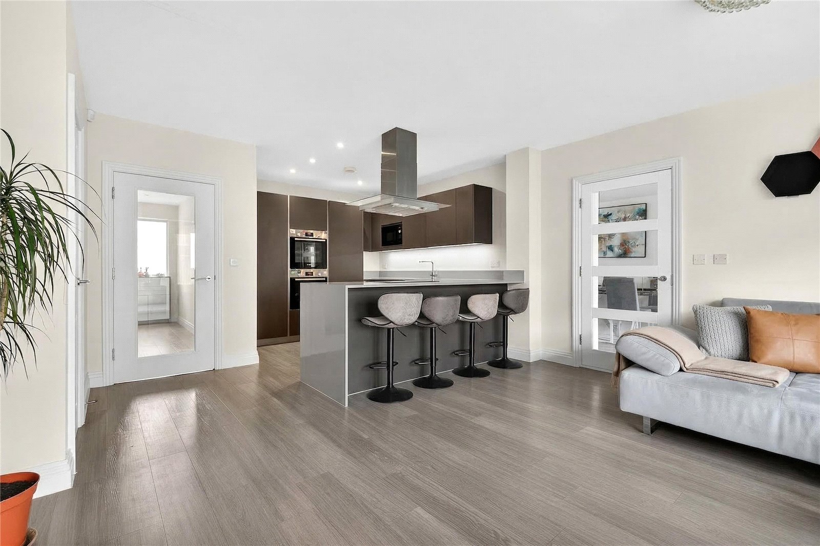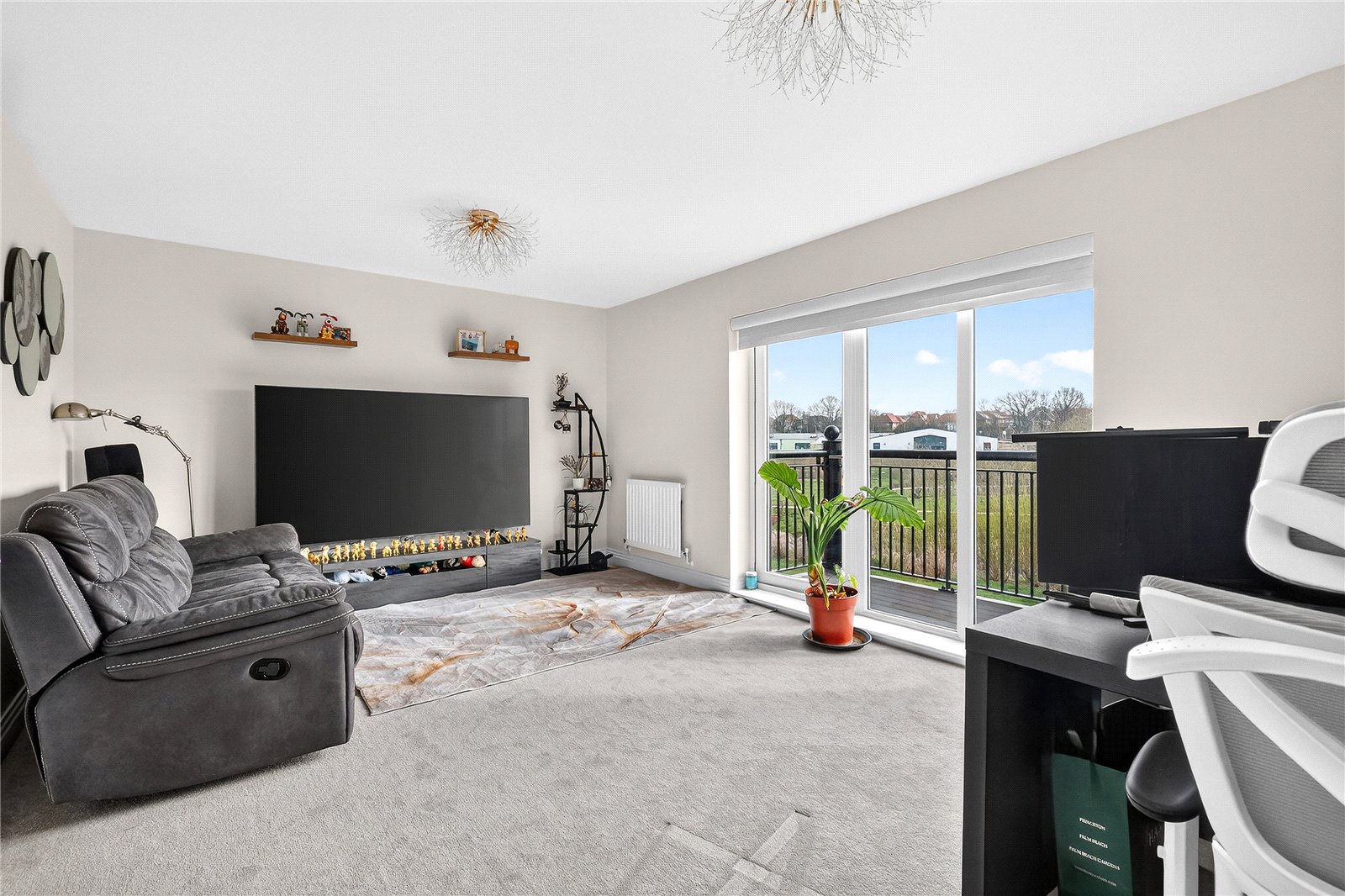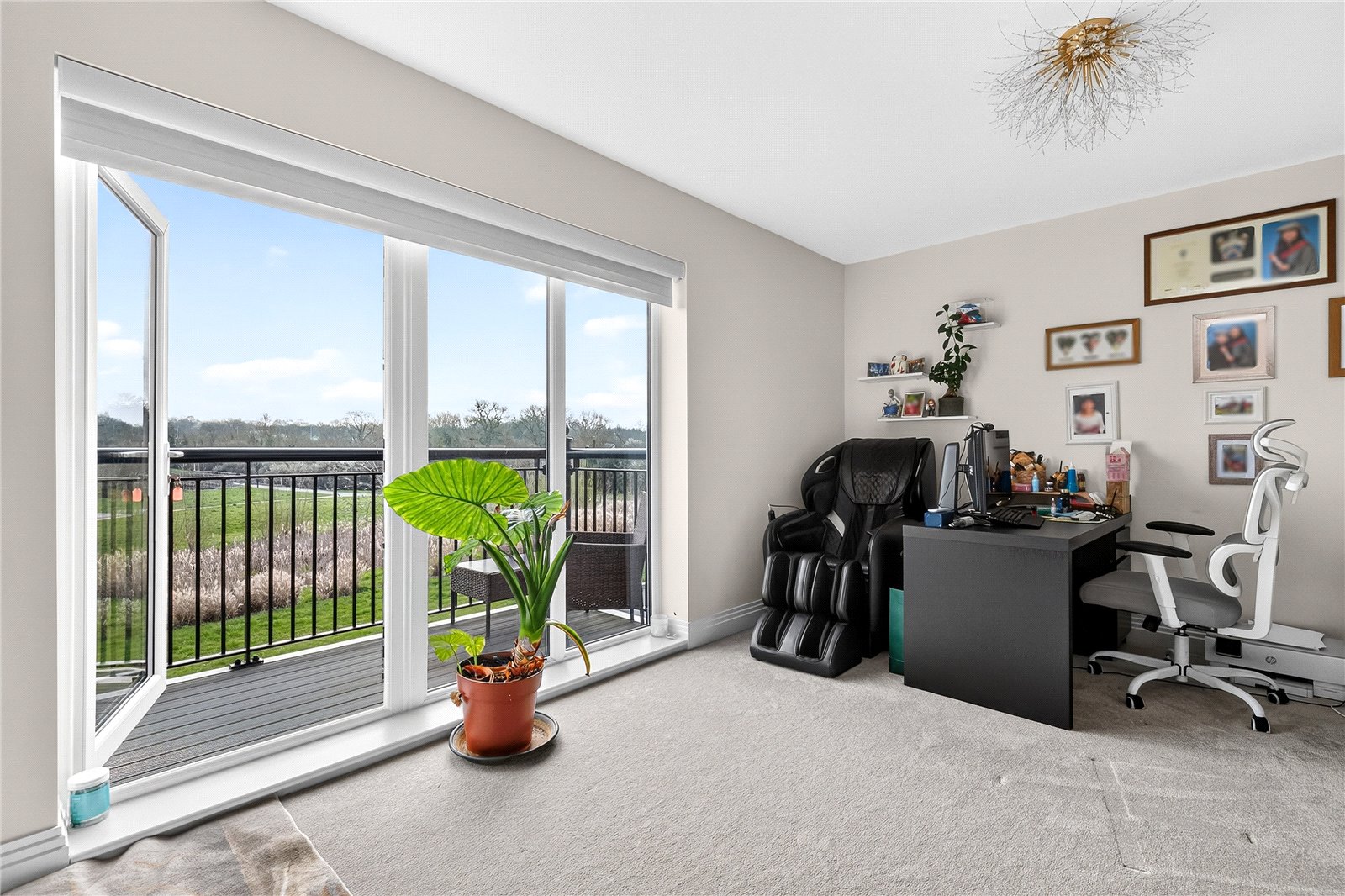 Upstairs, the first floor has two generously proportioned double bedrooms, a dedicated living room, ideal as a teenage retreat, home cinema, or sophisticated sitting room, and a walk-in wardrobe that adds a genuine touch of luxury. The principal bedroom suite comfortably accommodates a king-size bed and substantial furniture, while a private balcony offers a moment of calm above the rooftops.