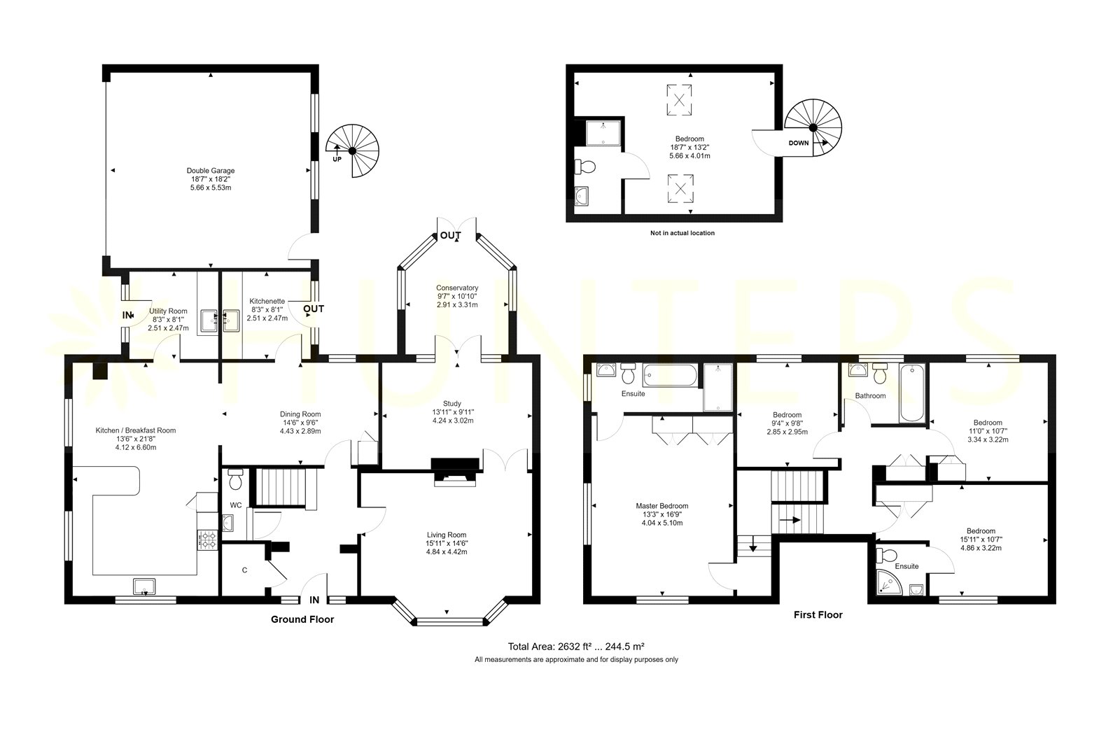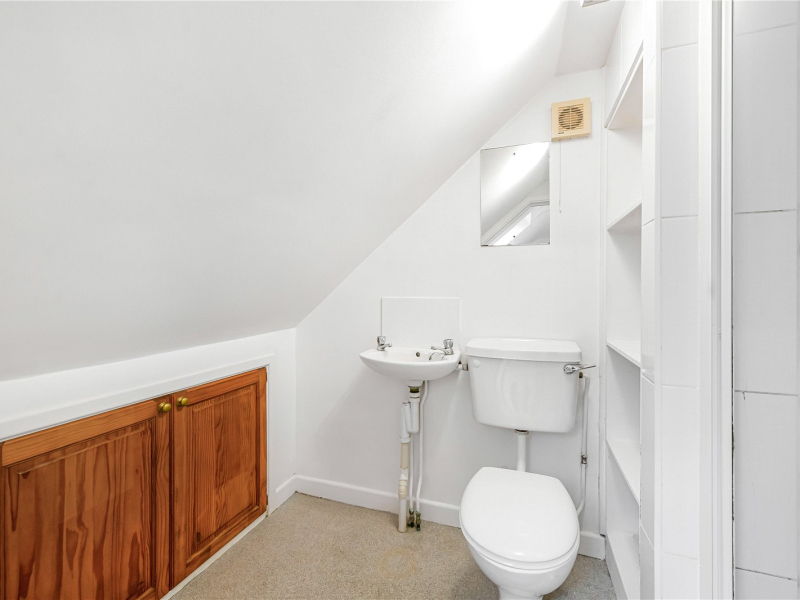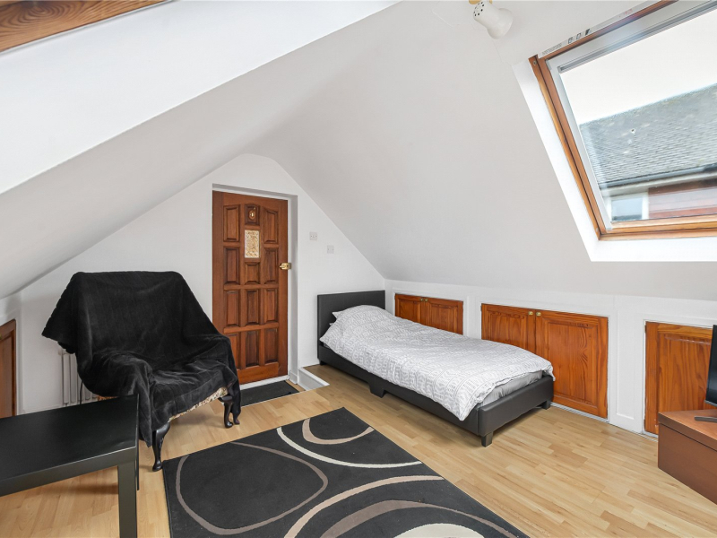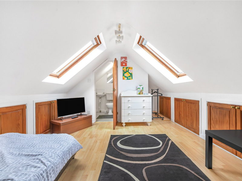 Bedroom Five is located above the double garage and is accessed via a spiral staircase. This room offers eaves storage, ample space for free-standing furniture, and an en-suite shower room with WC, basin, and walk-in shower, ideal as a guest suite or independent living space.