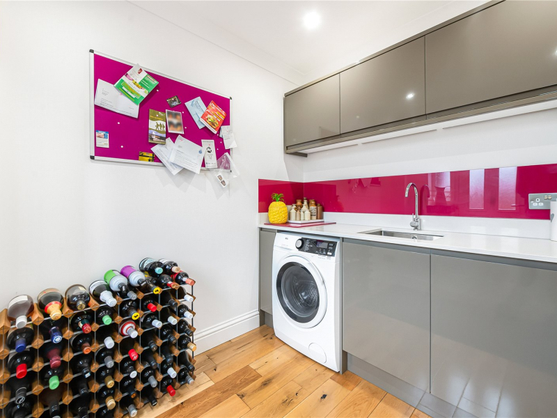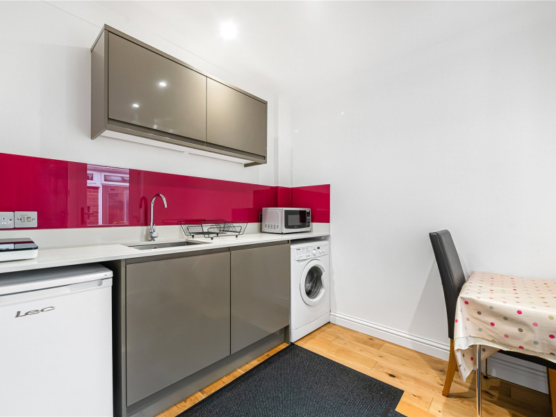 A secondary kitchen area, currently serving as a self-contained kitchenette for Bedroom 5, offers additional facilities including a sink, under-counter fridge/freezer, and washing machine. This area also provides direct access to the garden and was previously rented out for £725pcm.