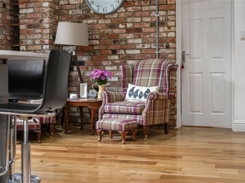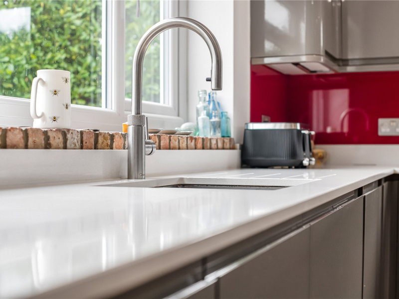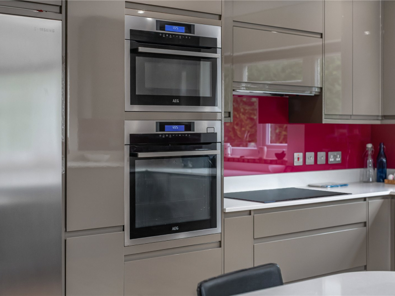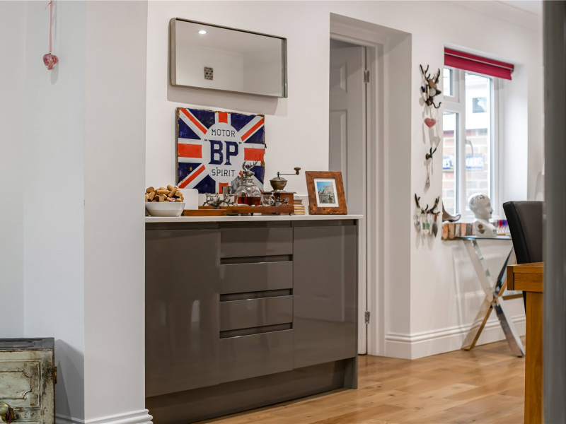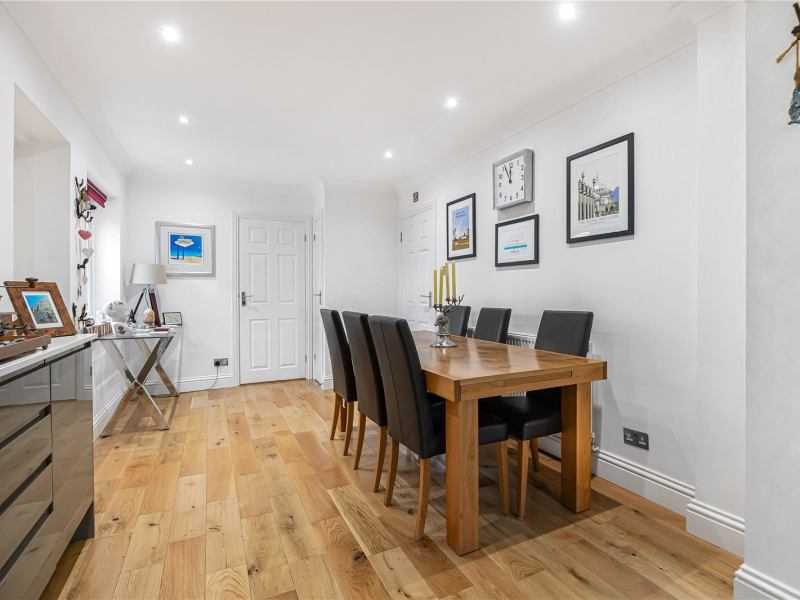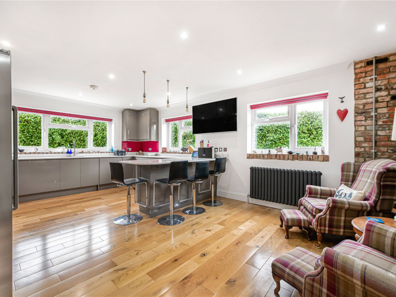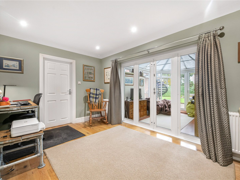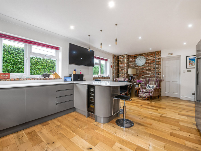 At the heart of the home lies the open-plan, L-shaped kitchen and dining area. This modern kitchen is fitted with integrated appliances including a Quooker hot tap, wine cooler, fridge/freezer, dishwasher, and double oven & microwave, along with ample worktop and storage space. There is room for an American-style fridge/freezer and a large dining table, making it perfect for entertaining. The space also benefits from electric blackout blinds. From the dining area, there is access to a utility room with further storage and space for a washing machine.