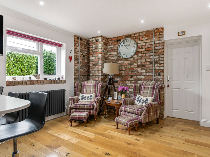 Upon entering the home, you are welcomed by a spacious entrance hall with a large storage cupboard and a convenient downstairs WC. Stairs to the first floor are also accessible from here. To the right is a comfortable living room featuring a wood-burning fireplace , perfect for cozy evenings, and a large front-facing bay window that floods the space with natural light. Towards the rear, there is an additional reception room ideal for use as a study or snug, leading into a conservatory with direct access to the rear garden.