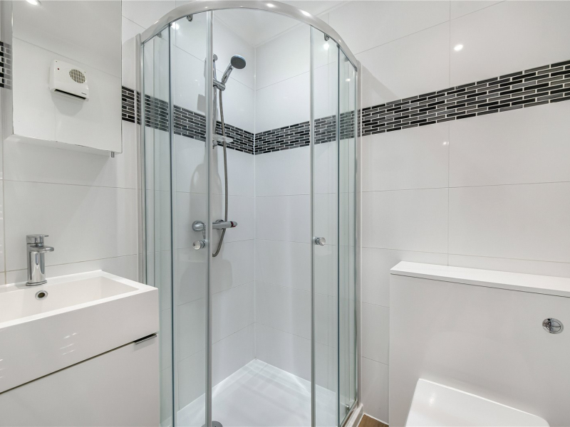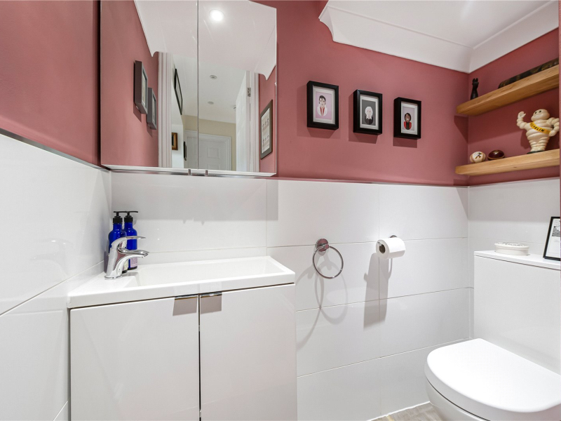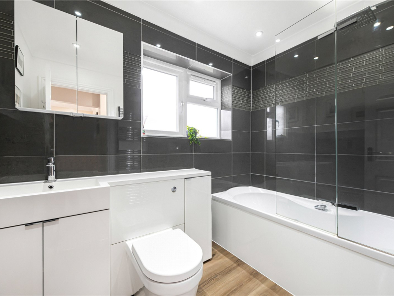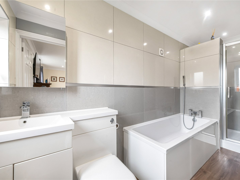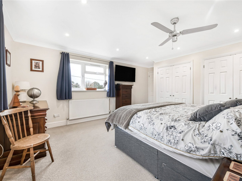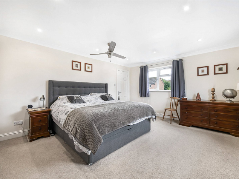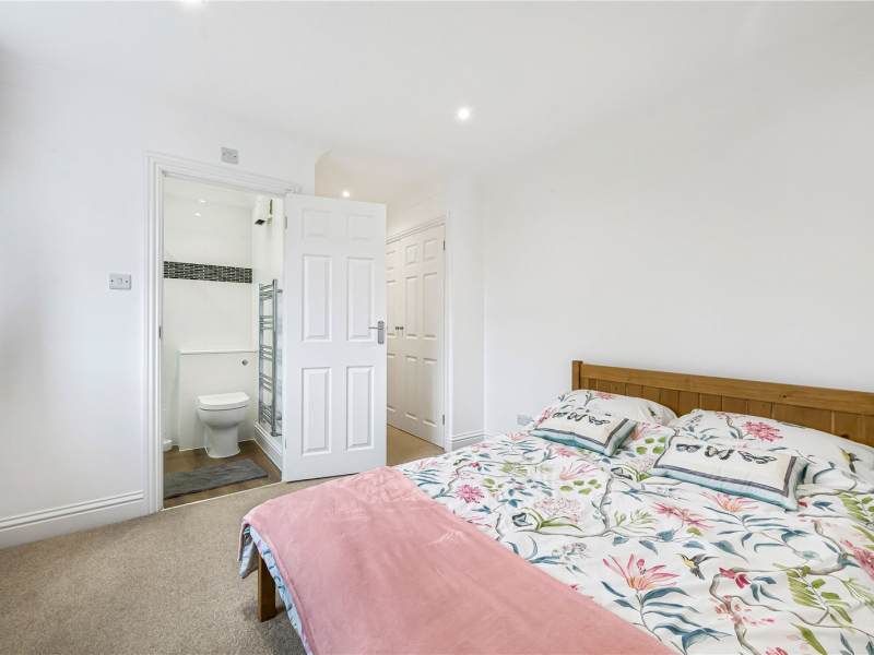 Upstairs, a split-level landing leads to a spacious hallway with access to the partly boarded and insulated loft space via a pull-down ladder. The impressive master suite features built-in wardrobes, dual-aspect windows, and a modern en-suite bathroom complete with bath, walk-in shower, basin, and WC. Bedroom Two also benefits from built-in storage and its own en-suite shower room. There are two further double bedrooms, both generously sized, and a contemporary family bathroom with a white suite. A useful storage cupboard is also located on the landing.